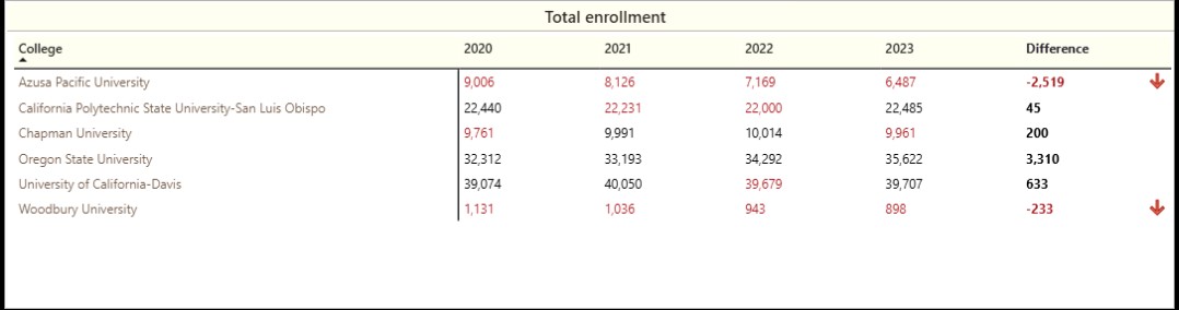 Below is a example of the College Viability enrollment trends report. Several schools have minor fluxuations year-to-year, but it is obvious that 2 schools have experienced signficant drops in students enrollment for consecutive years.